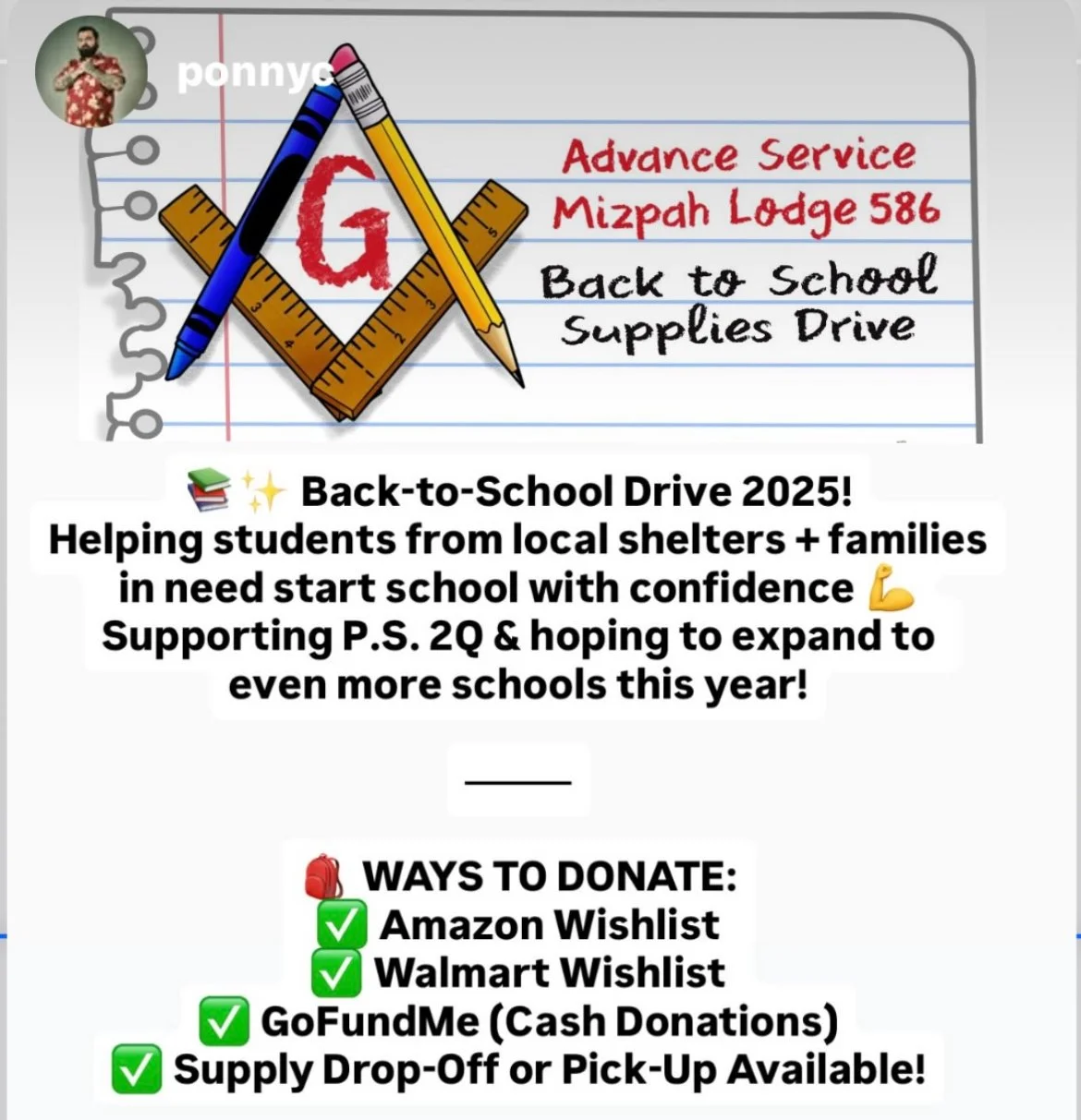 For the past three years, the Advance Service Mizpah Lodge 586 Back-to-School Drive has proudly supported approximately 75–85 students annually at P.S. 2Q — many of whom are living in local shelters or facing financial insecurity. With the school community growing and the need greater than ever, I’m continuing this mission with the goal of expanding our reach to support even more students across additional schools in our area.