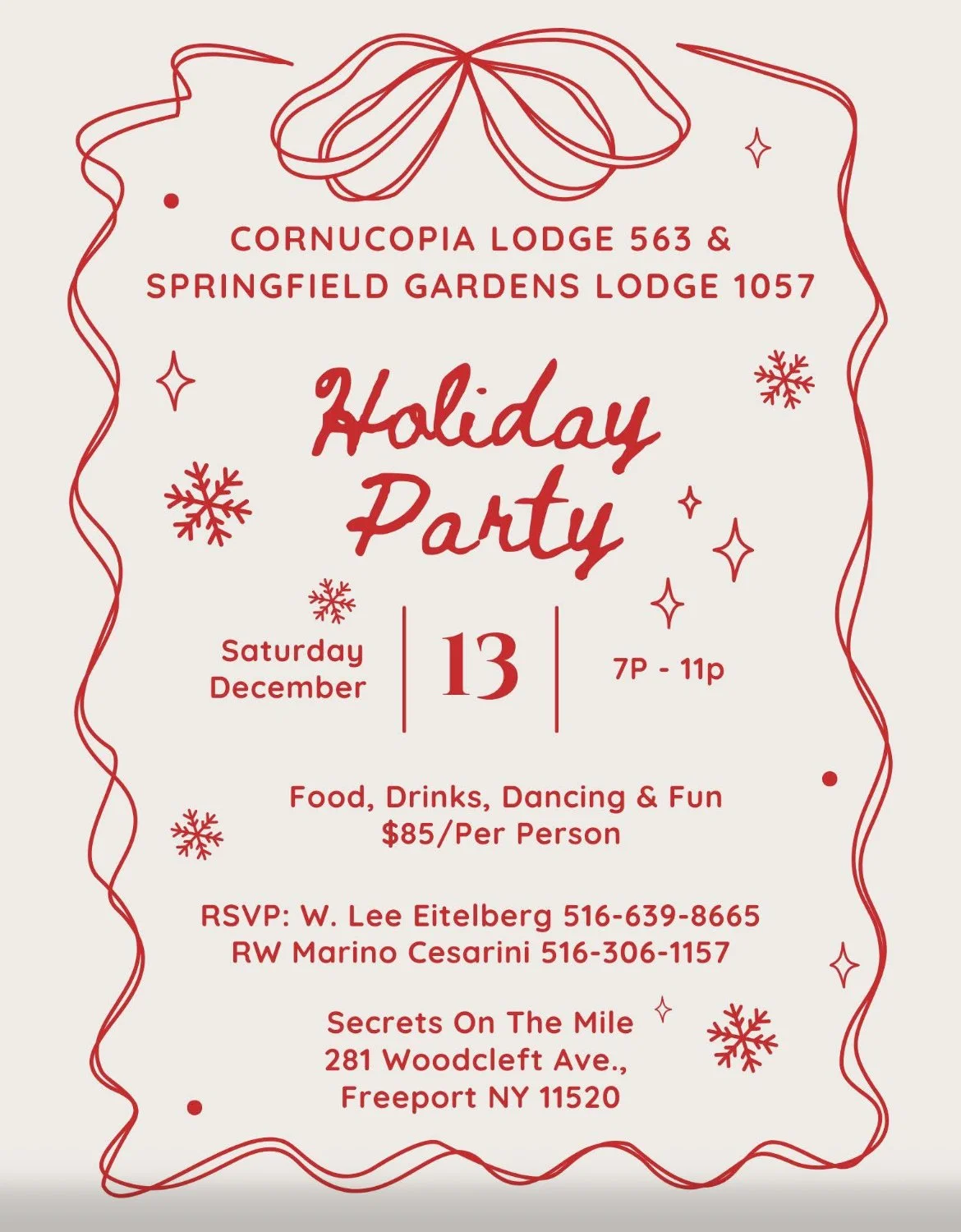 Join fellow Masons from Cornucopia Lodge 563 and Springfield Gardens Lodge 1057 for an evening of holiday cheer, great food, open bar, lively dancing, and fraternal fellowship. This event brings together members, families, and guests in a relaxed venue perfect for seasonal celebration.
