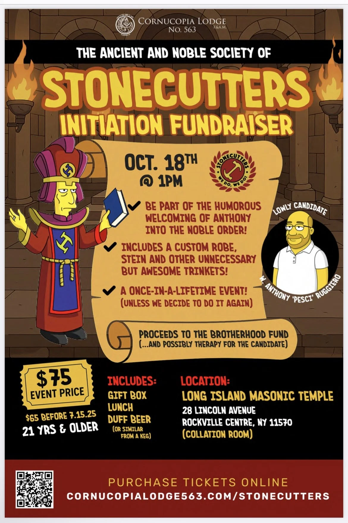 Men 18 and older. You do not need to be a Freemason, and attending will not make you one. This is simply a fun, fan-fueled event for those who love The Simpsons and the legendary Stonecutters episode.